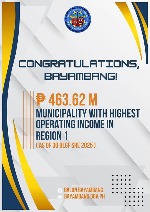 Ang Bayambang ay naitala bilang nangungunang munisipalidad sa buong Rehiyon Uno batay sa datos ng Bureau of Local Government Finance (BLGF) mula sa kanilang Statement of Receipts and Expenditures (SRE) noong ikatlong quarter ng taong 2025.