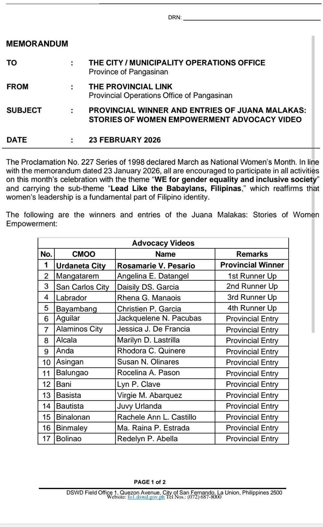 Muling pinatunayan ng bayan ng Bayambang ang galing ng mga Bayambangueña matapos hirangin si Christien P. Garcia ng Brgy. Zone 6 bilang 4th Runner Up mula sa 41 entries ng lalawigan sa “Juana Malakas: Stories of Women Empowerment Advocacy Video.”