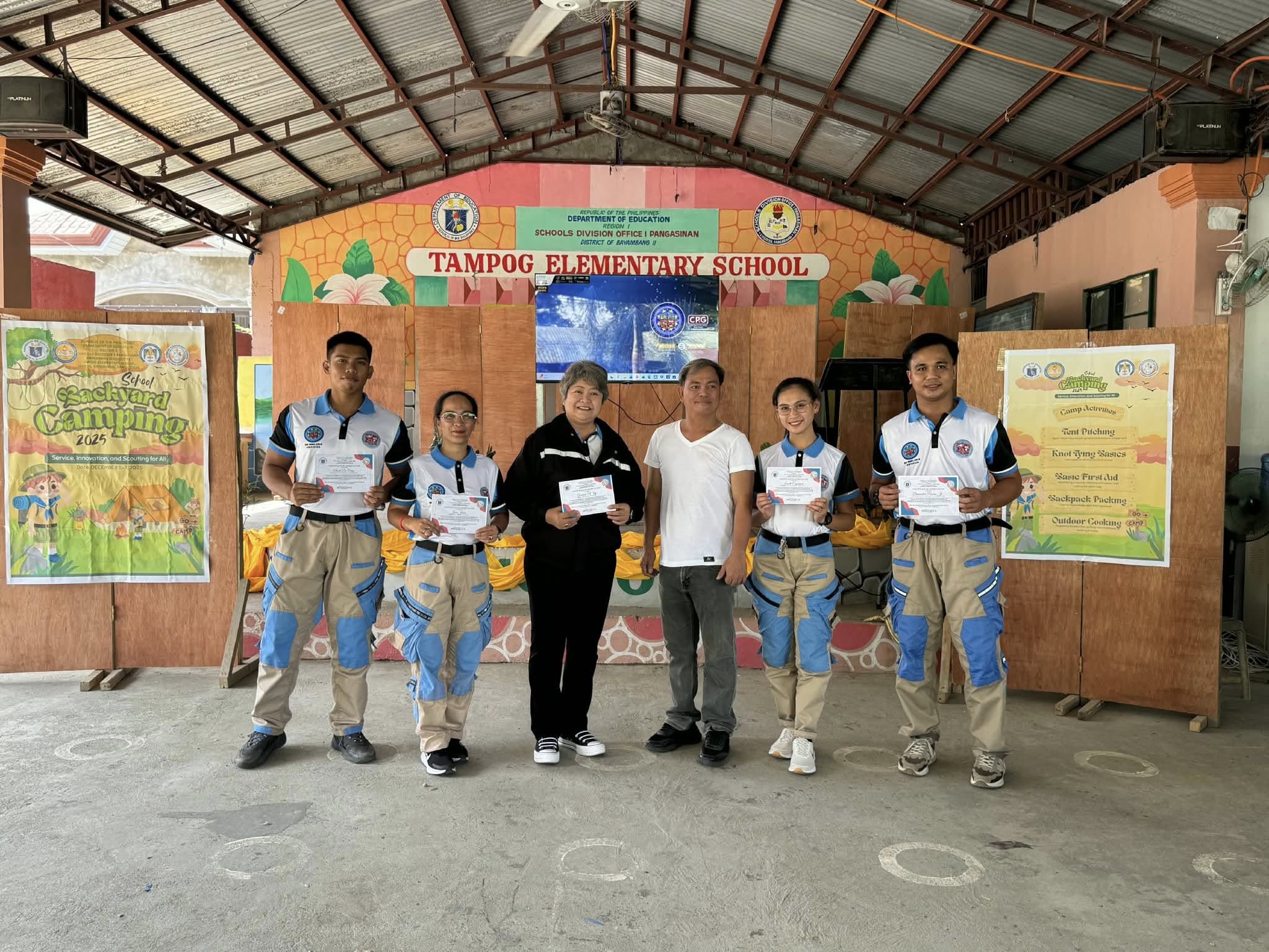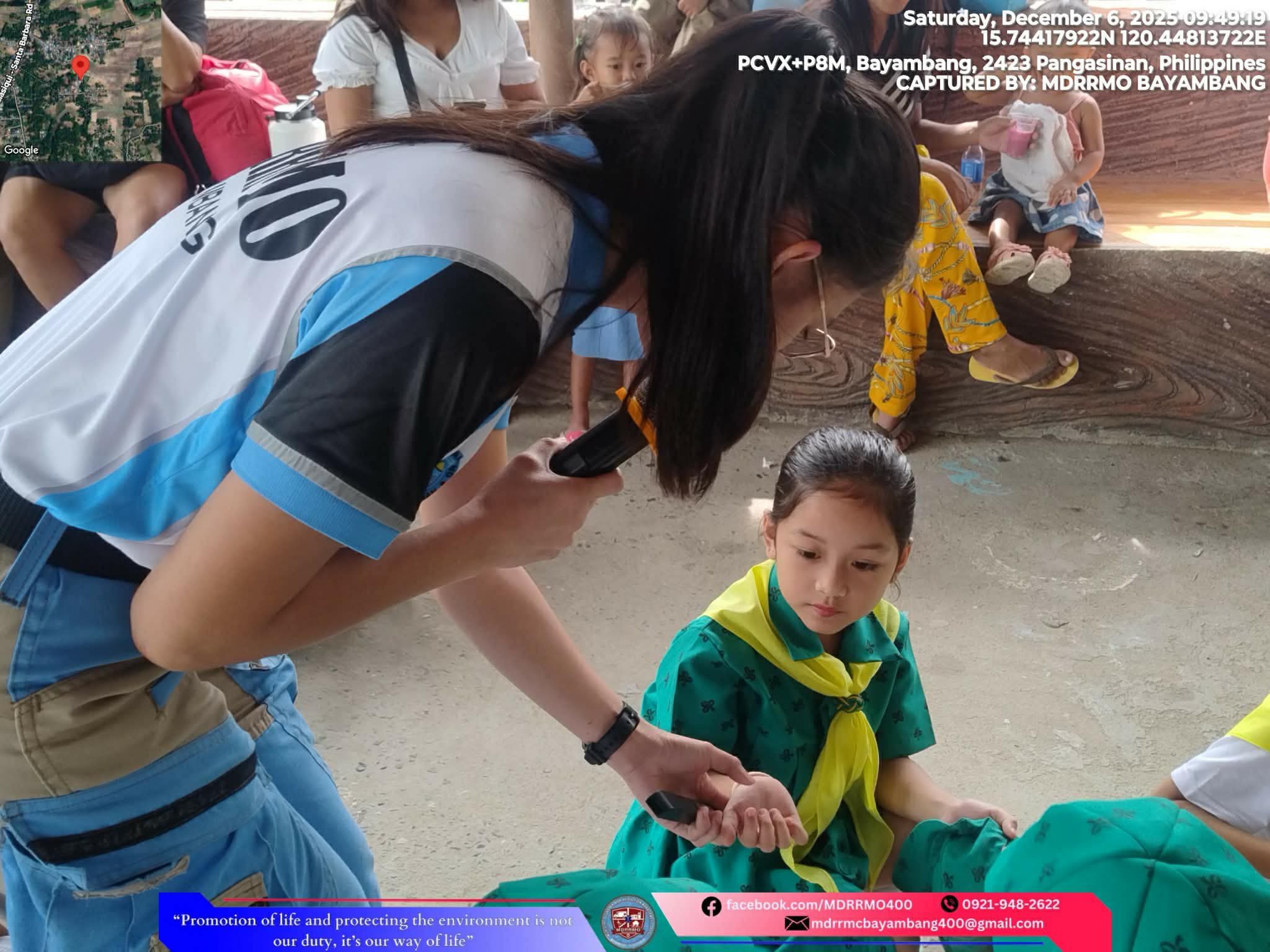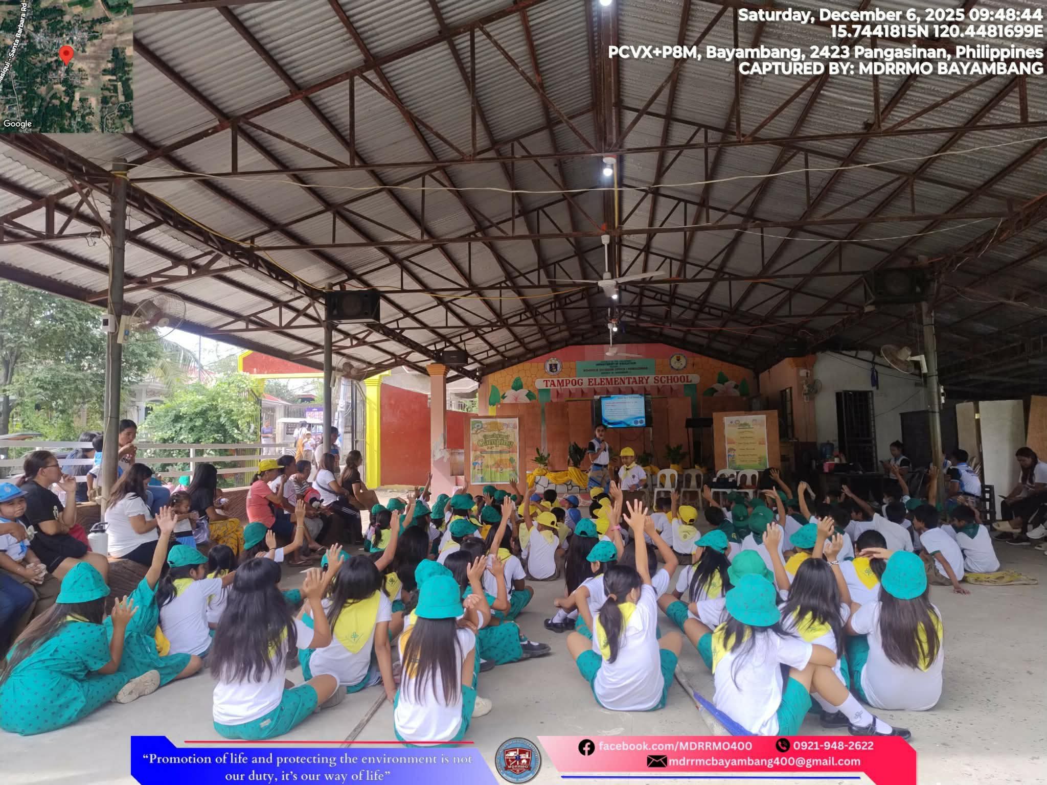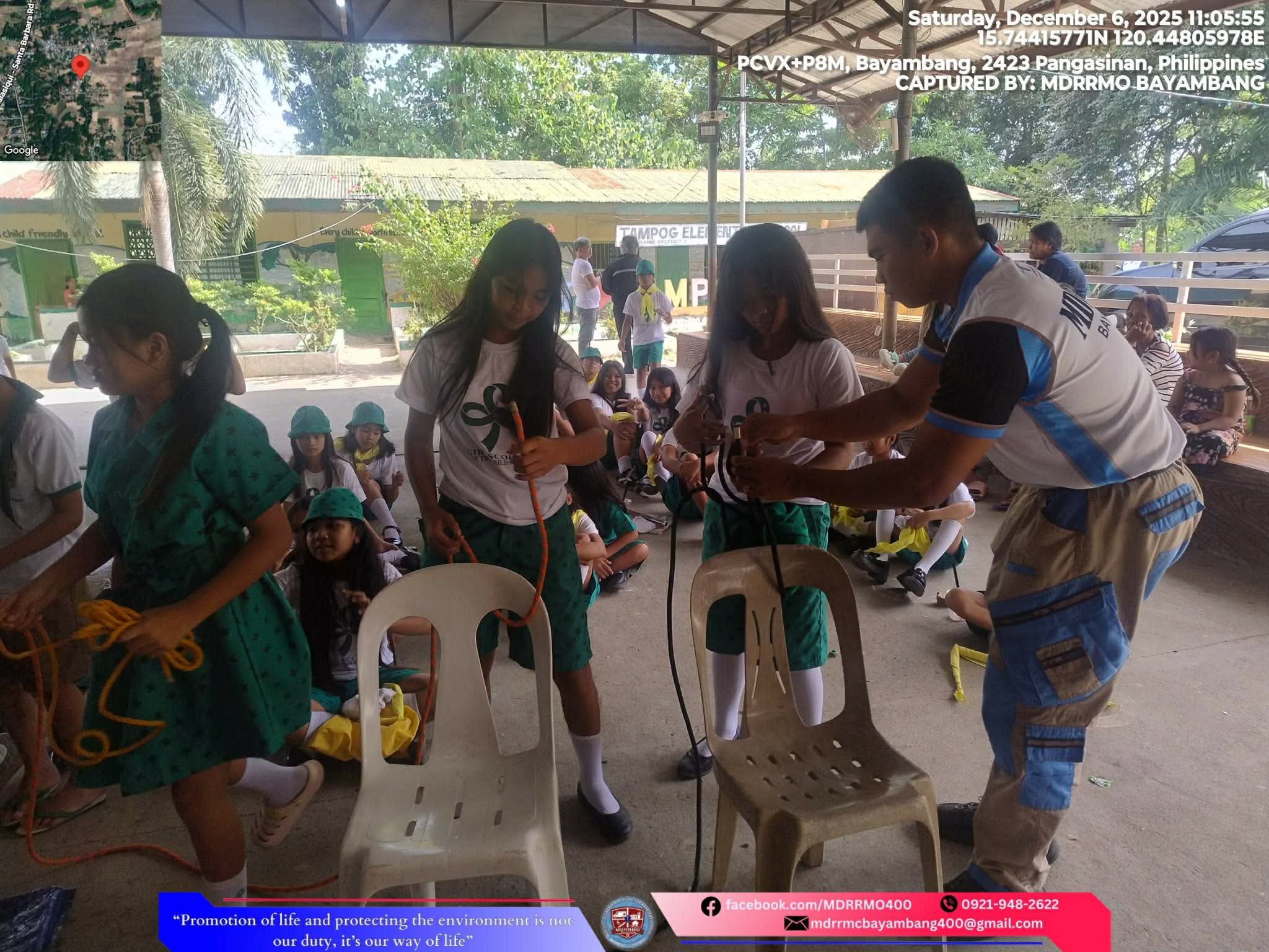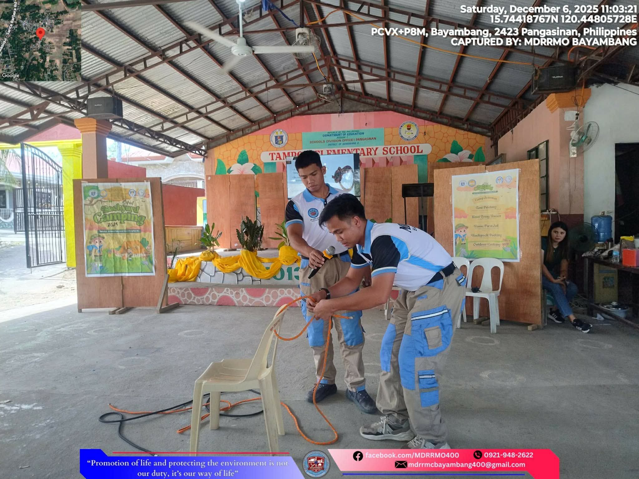 Nagsagawa ang MDRRMO ng knot tying at basic first aid training para sa mga mag-aaral ng Tampog Elementary School bilang bahagi ng kanilang backyard camping. Namahagi rin sila ng mga hard hat at 3-in-1 whistle, flashlight, at ballpen para sa karagdagang proteksiyon. Sa aktibidad na ito, sinanay mga ang mga bata sa tamang pagtugon sa sakuna at natulungang mapalakas ang kultura ng kahandaan.