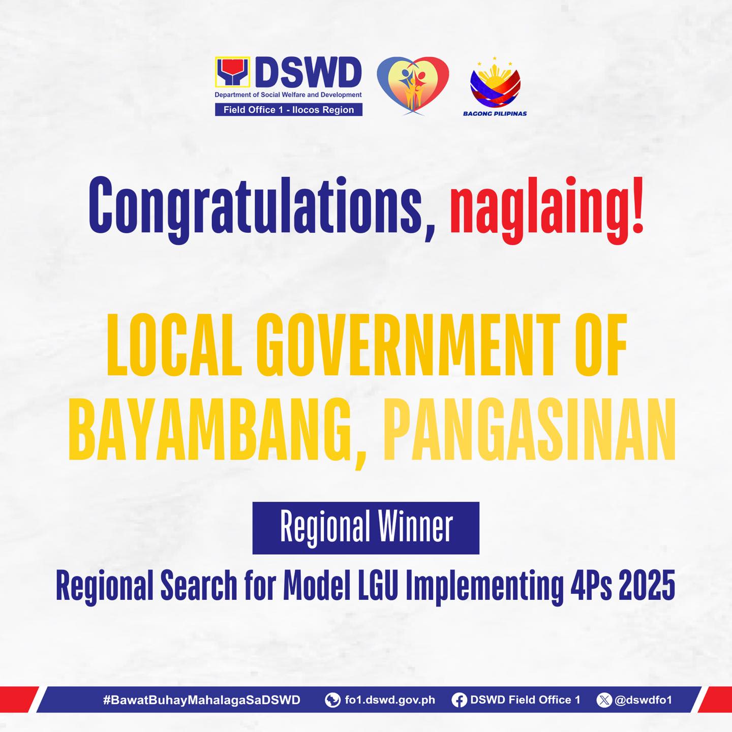 Ang LGU-Bayambang, sa pamumuno ni Mayor Nina Jose-Quiambao, ay itinanghal ng DSWD Region I bilang regional winner sa DSWD Region I Search for Model LGU Implementing 4Ps para sa taong 2025.