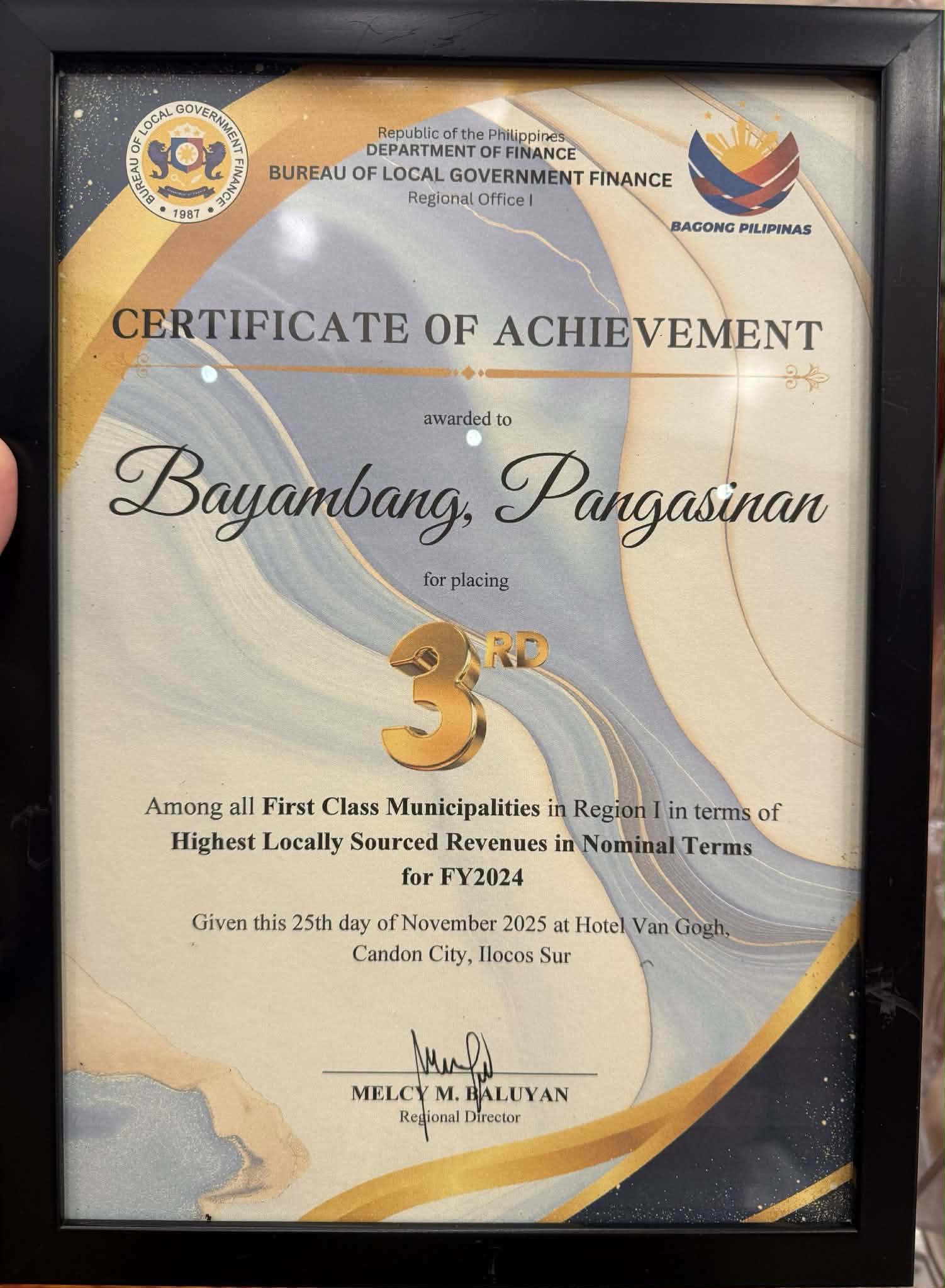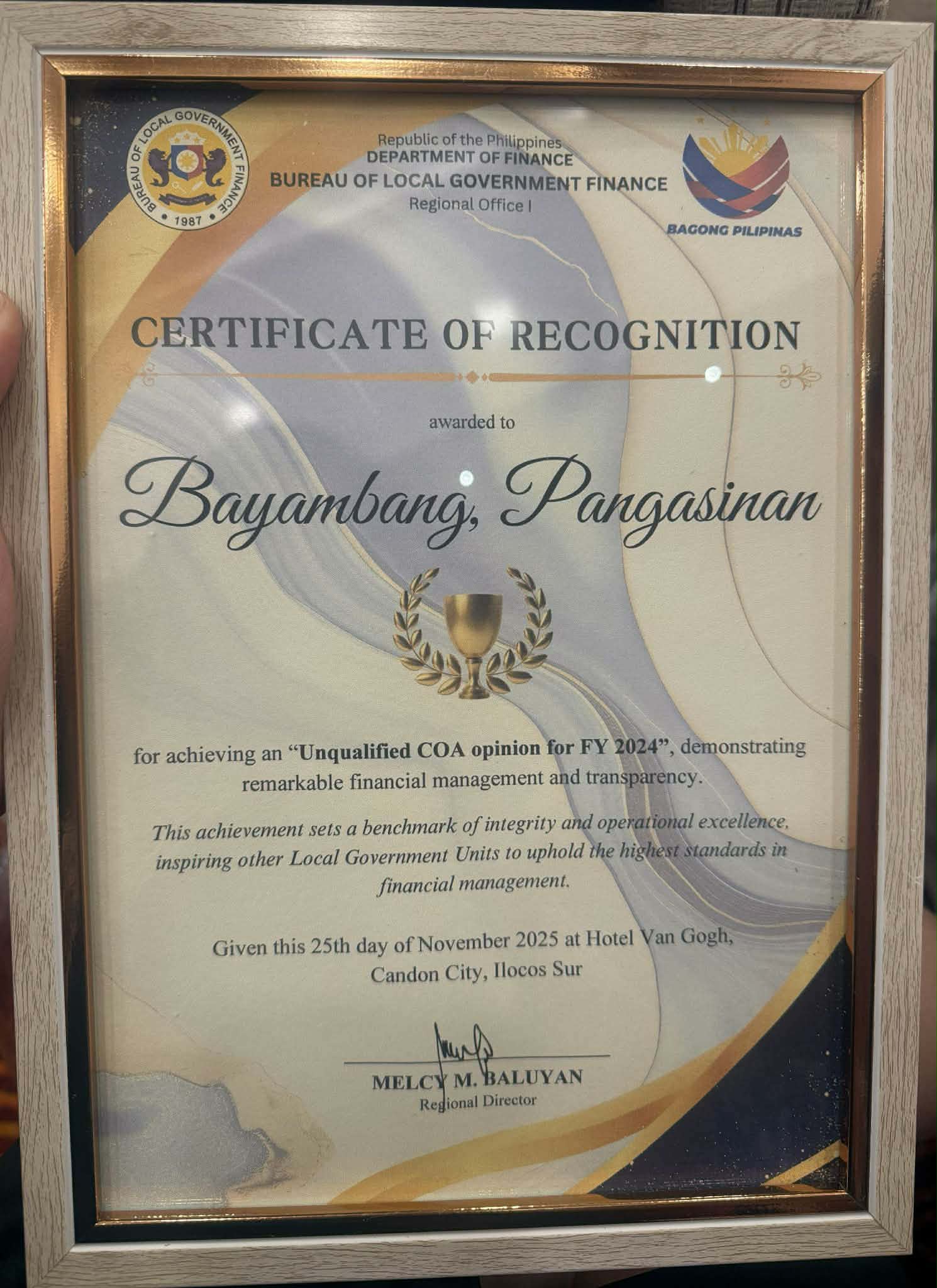 Dalawang parangal ang naiuwi ng ating bayan mula sa Bureau of Local Government Finance (BLGF) Region 1 sa ginanap na REGATA Year-End Assessment Conference and Recognition of Top Performing LGUs, sa Hotel Van Gogh, Ilocos Sur noong Nobyembre 24–28, 2025.