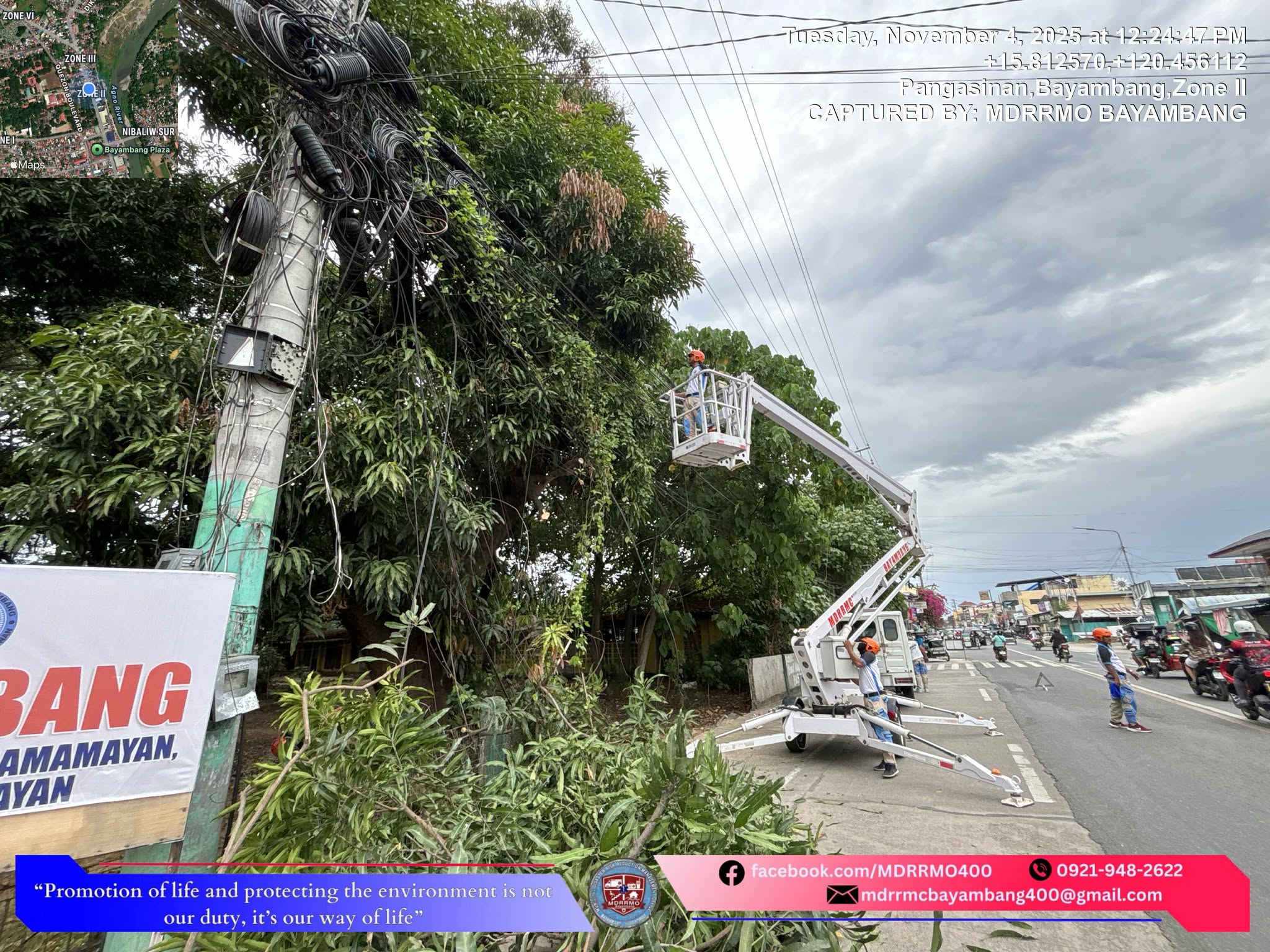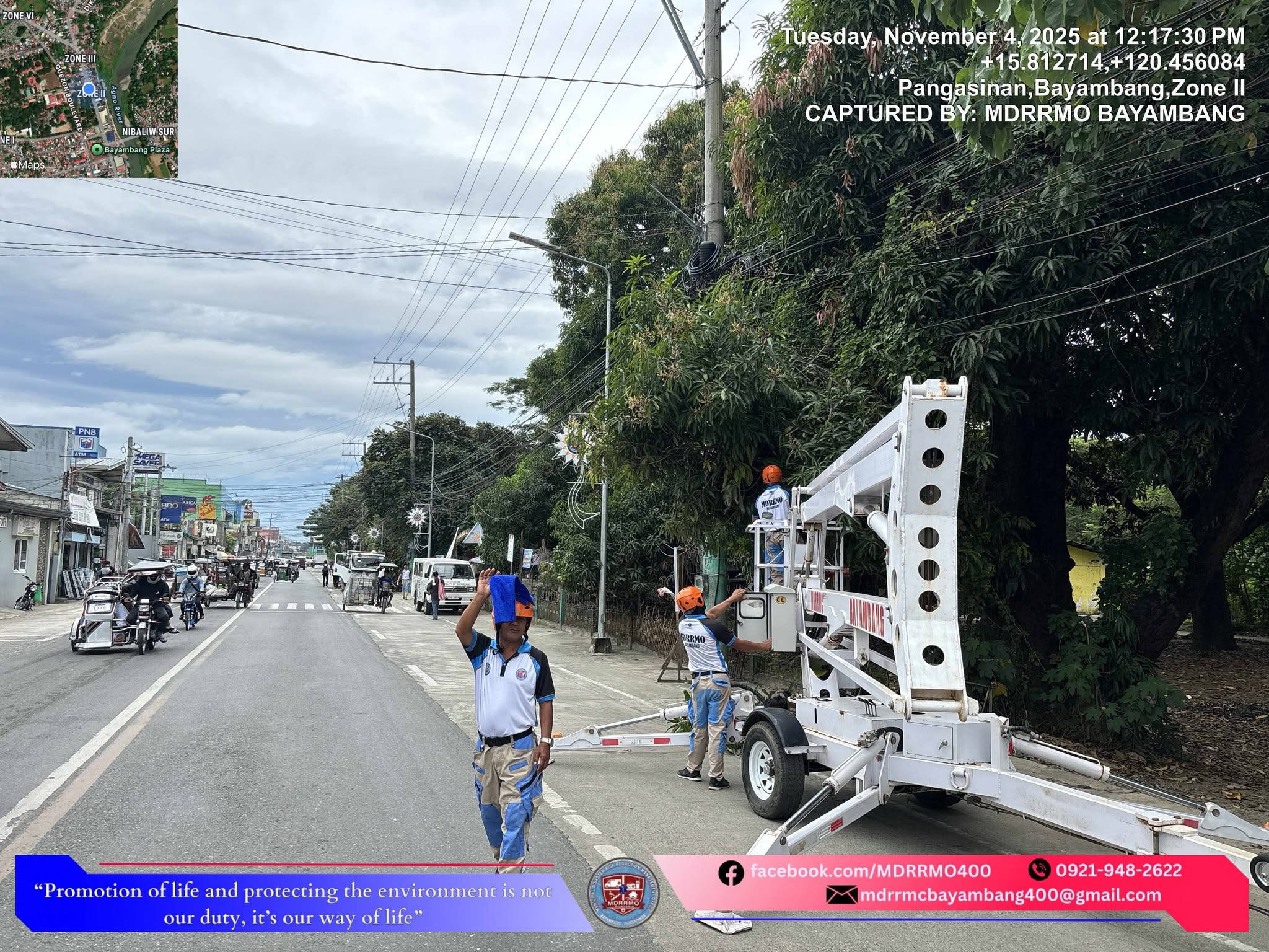 Ang MDRRMO team ay nag-focus sa clearing ng mga overgrowth ng punongkahoy sa harapan ng lumang Bayambang Central School bilang paghahanda sa pag-iinstall ng Christmas lights sa lugar.