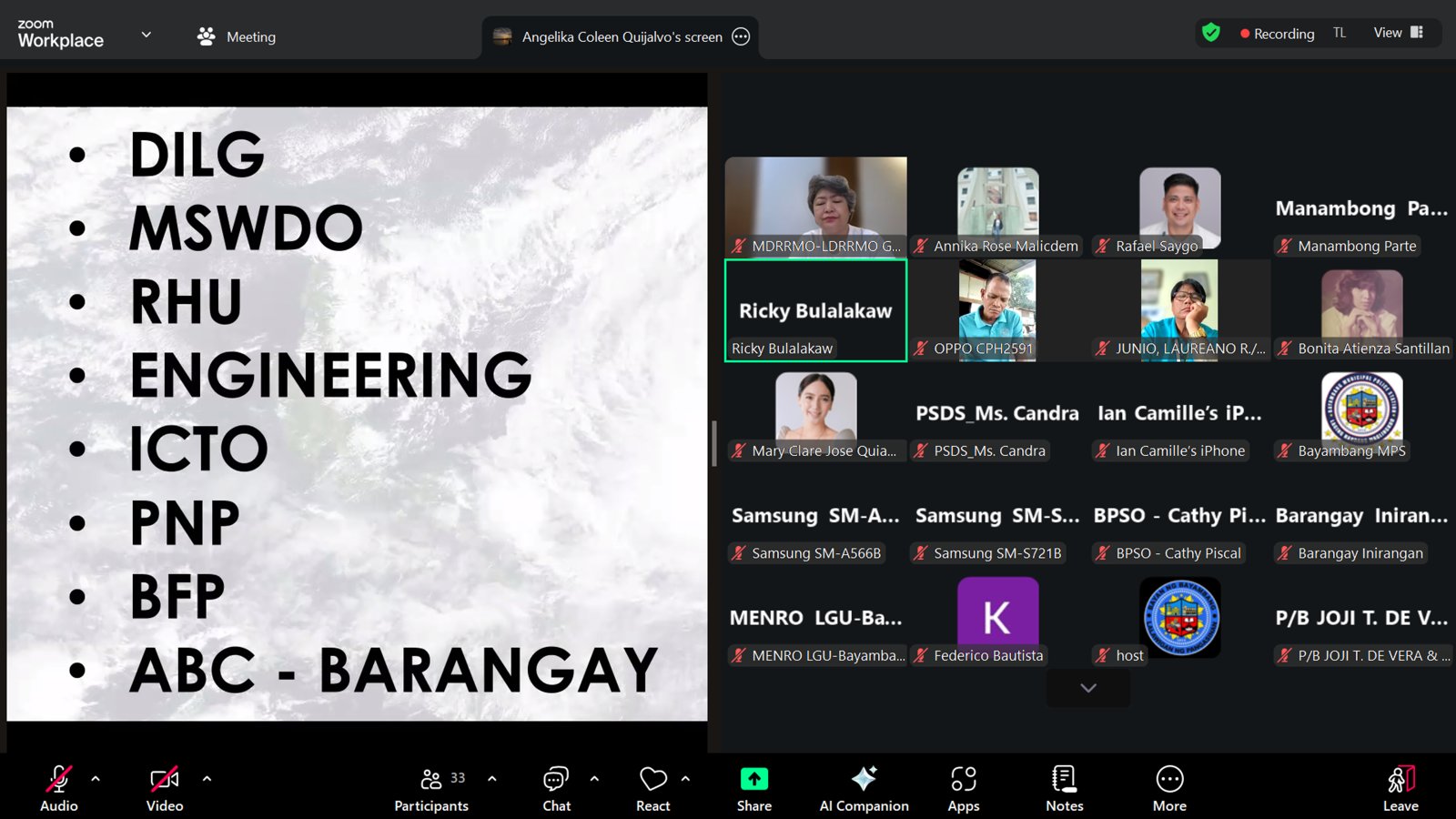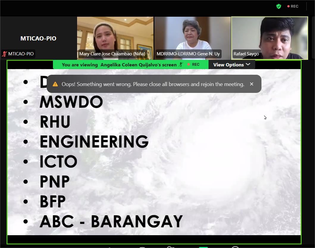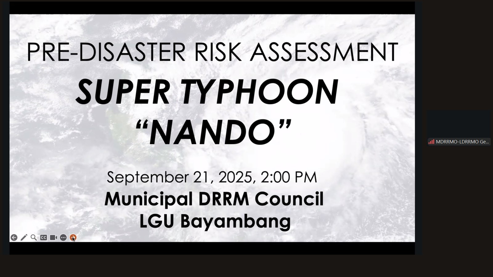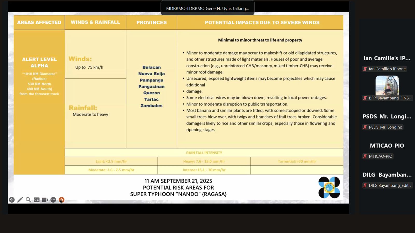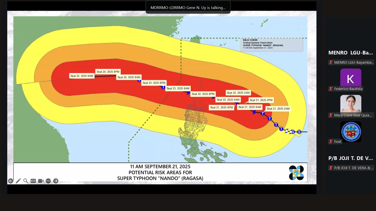 Bilang paghahanda sa pagdating ng bagyong ‘Nando,’ pinangunahan ni Mayor Niña Jose-Quiambao ang isang Pre-Disaster Risk Assessment (PDRA) ngayong araw, Setyembre 21, 2025, kasama ang lahat ng miyembro ng Bayambang Municipal Disaster Risk Reduction Council (MDRRMC) sa pamamagitan ng Zoom video.