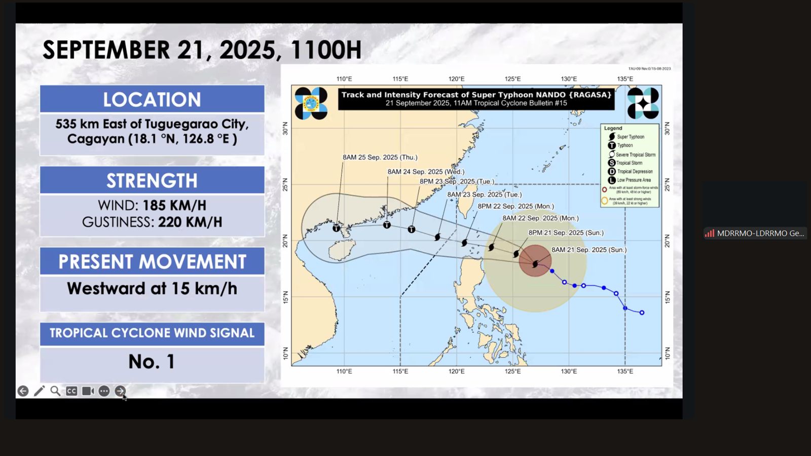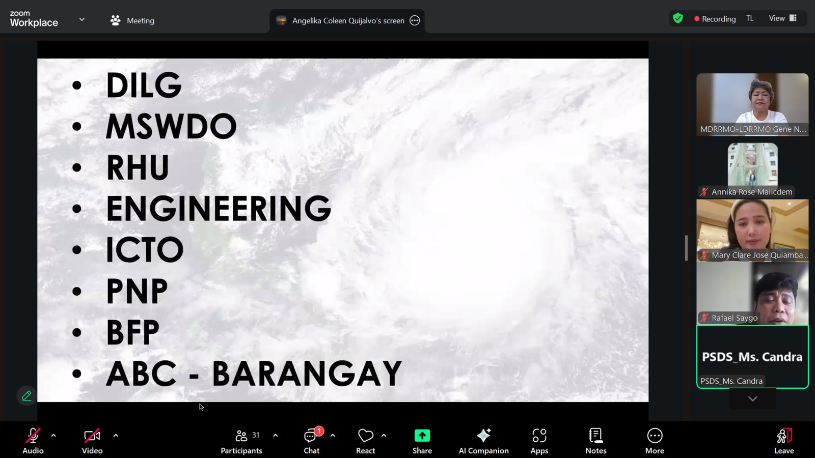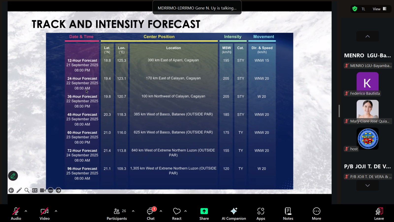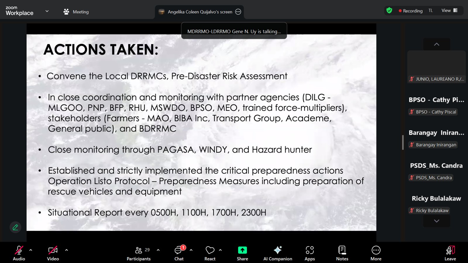 Bilang paghahanda sa pagdating ng bagyong ‘Nando,’ pinangunahan ni Mayor Niña Jose-Quiambao ang isang Pre-Disaster Risk Assessment (PDRA) ngayong araw, Setyembre 21, 2025, kasama ang lahat ng miyembro ng Bayambang Municipal Disaster Risk Reduction Council (MDRRMC) sa pamamagitan ng Zoom video.