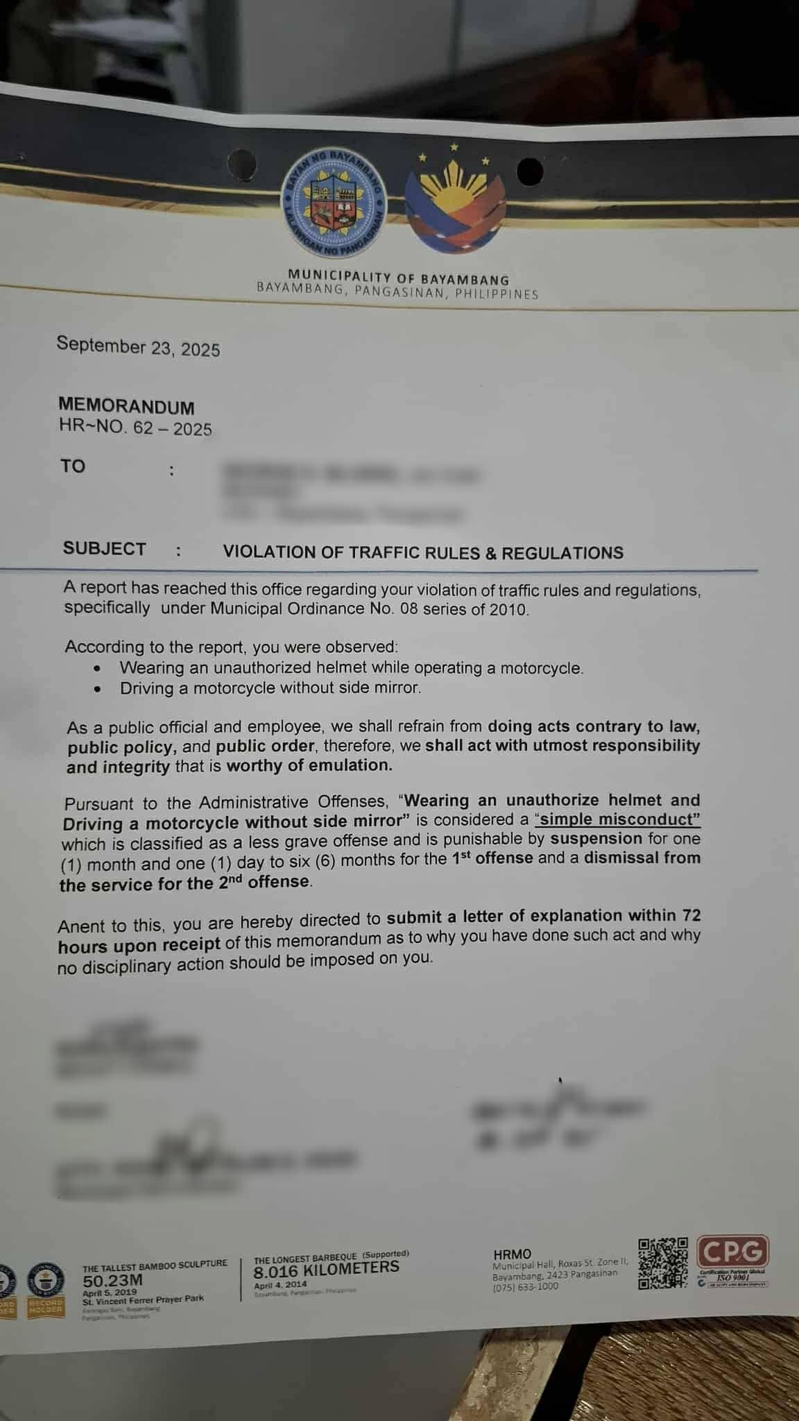 Ang mga naturang kawani ay pinagpapaliwanag sa pamamagitan ng isang liham sa loob ng 72 oras kung bakit nagawa ang violation.