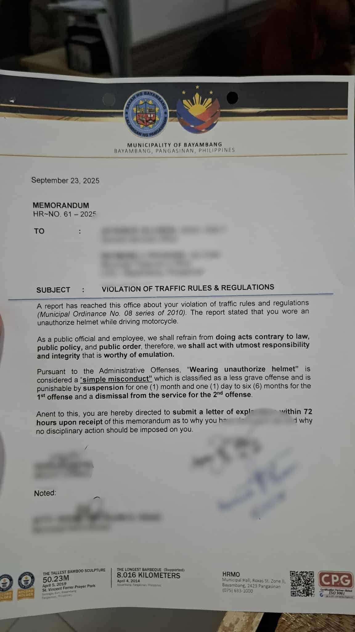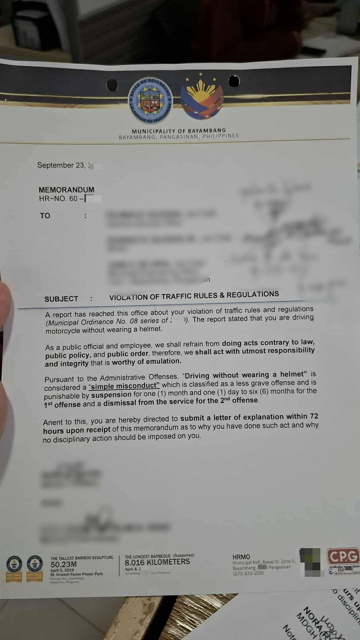 Anim na empleyado ng Munisipyo ang inisyuhan ng reprimand letter matapos silang mahulihan ng violation kabilang ang hindi pagsuot ng helmet habang nagdadrive at kawalan ng side mirror, ayon sa ulat ng Task Force Disiplina members.