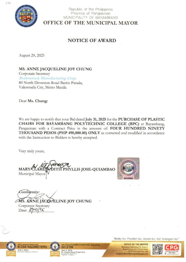 PURCHASE OF PLASTIC CHAIRS FOR BAYAMBANG POLYTECHNIC COLLEGE (BPC)