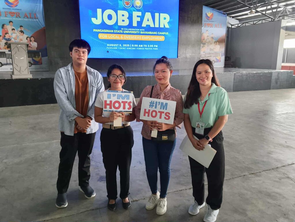 Sa isang job fair na pinagtulungang gawin ng PESO-Bayambang at PSU Bayambang Campusnoong August 6, 2025 sa Pavilion I, St. Vincent Ferrer Prayer Park, may naitalang 289 registered applicants, kung saan 72 sa mga ito ang hired on the spot (HOTS).