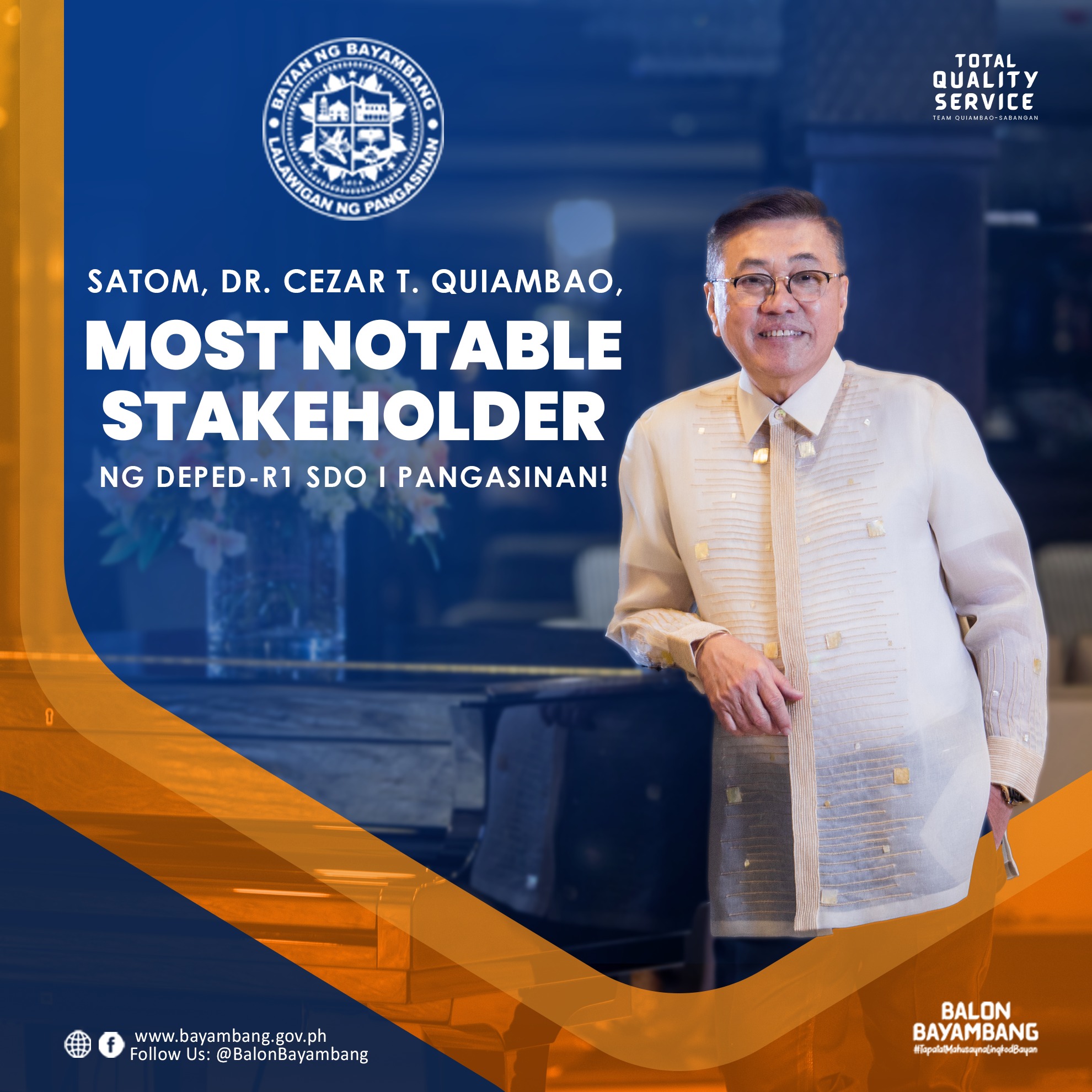 Pinarangalan bilang Rank 1 o Most Notable Stakeholder si SATOM, Dr. Cezar T. Quiambao, ng Department of Education Schools Division Office I Pangasinan. Ito ay bilang pagkikala sa kanyang ibinigay na suporta sa pagkakatayo ng Don Teofilo C. Mataban Memorial School sa Brgy. Ligue, kung saan tatlong classrooms at isang opisina nito ay kanyang ipinagawa gamit ang pribadong pondo.