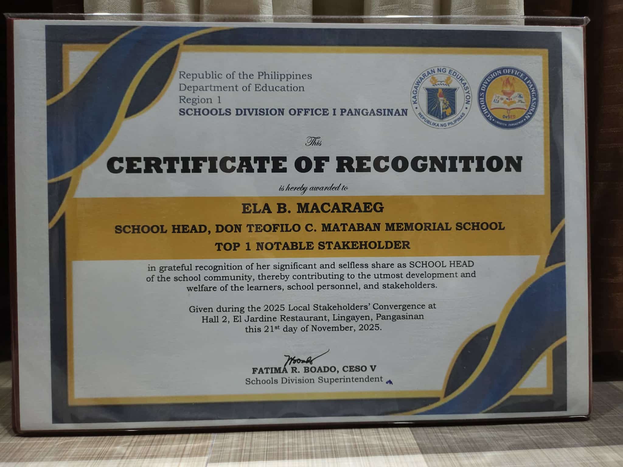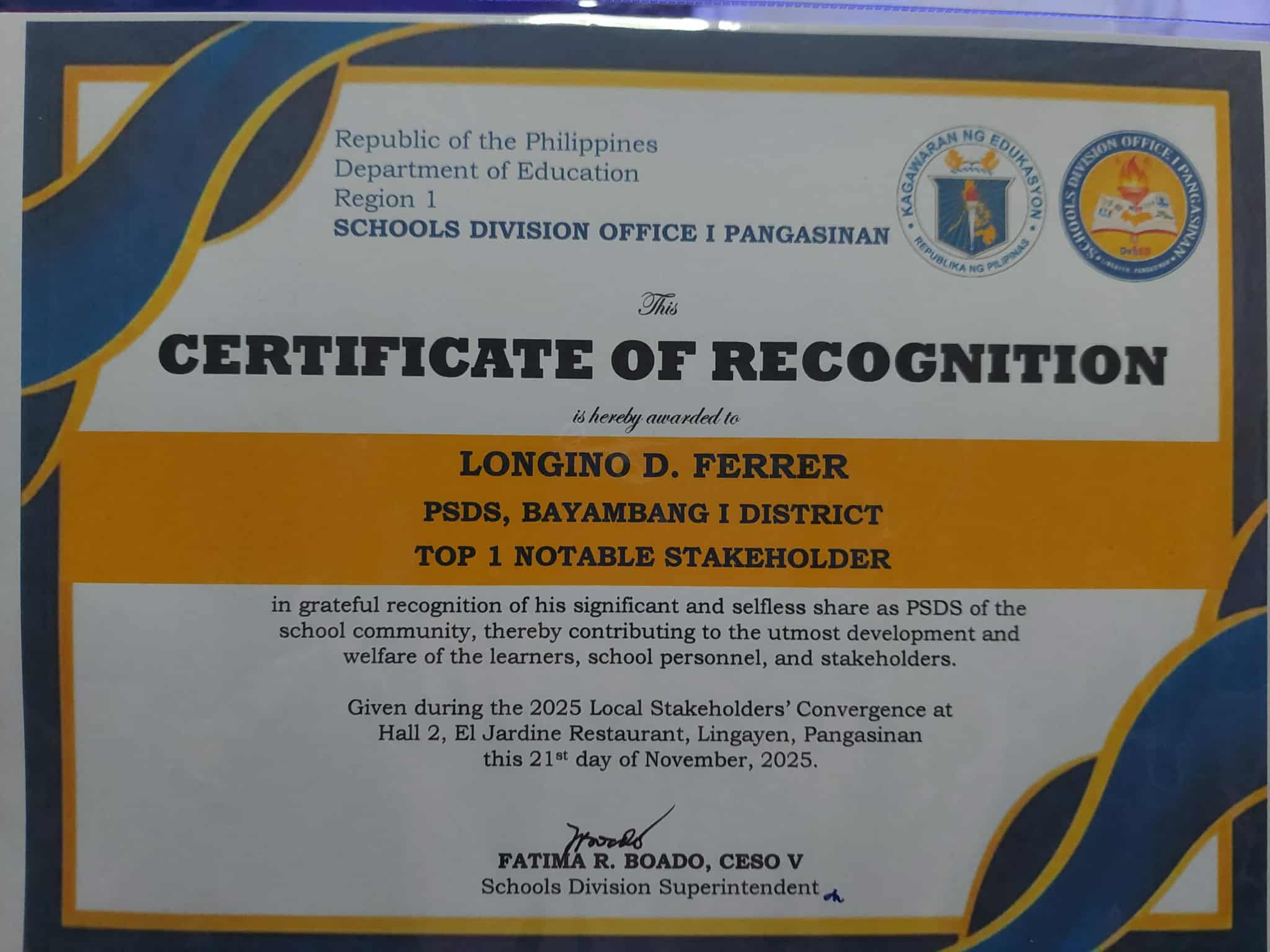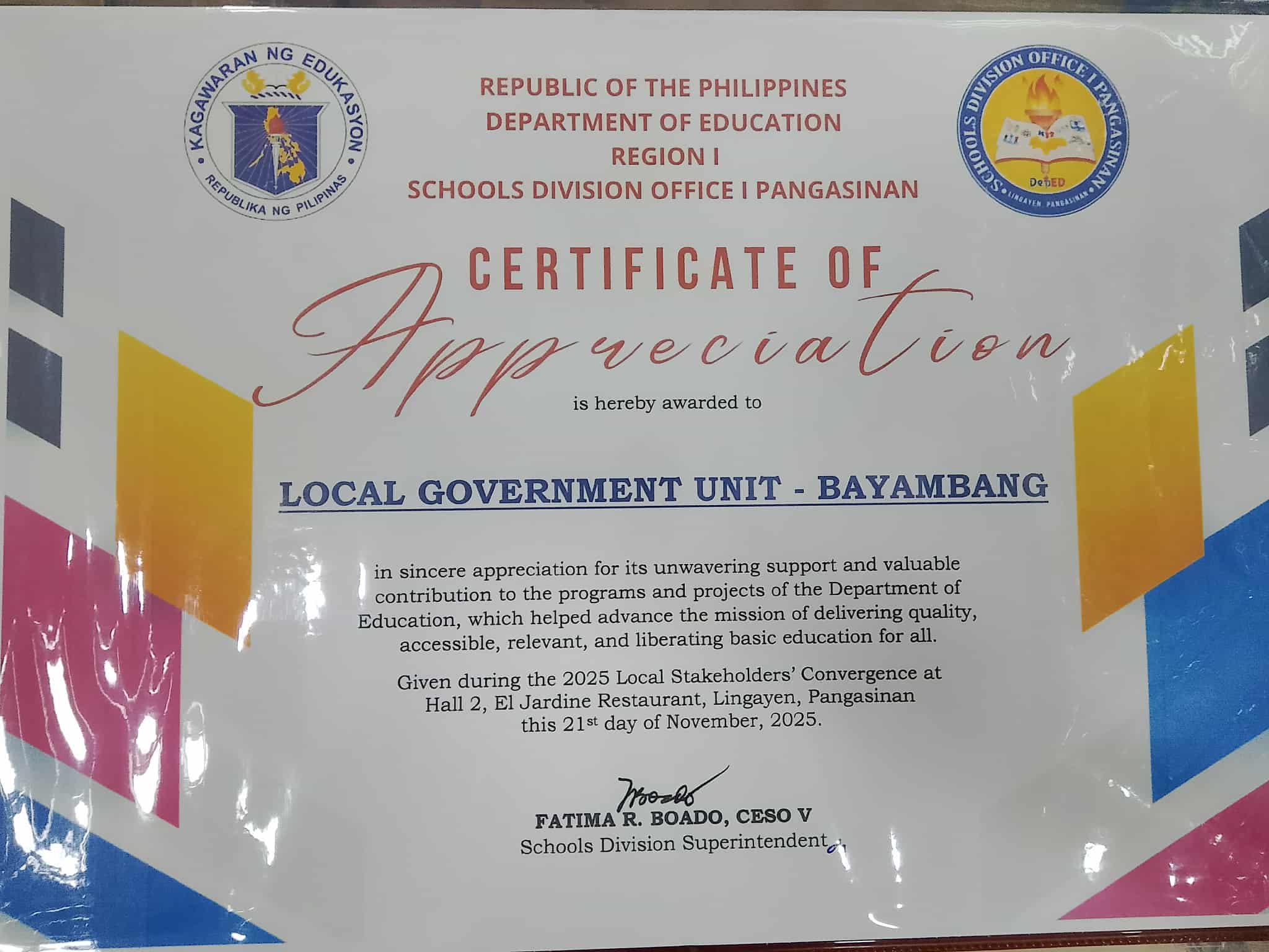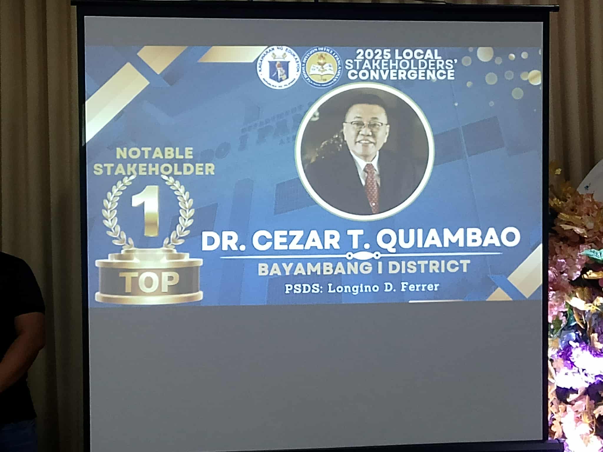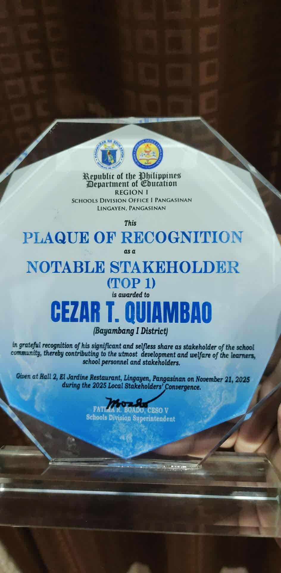 Pinarangalan ng Department of Education – Schools Division Office I Pangasinan si SATOM, Dr. Cezar T. Quiambao at ang Local Government Unit (LGU) ng Bayambang bilang pagkilala sa matibay nitong suporta sa mga programa at proyekto ng kagawaran, at ang parangal ay iginawad bilang parte ng 2025 Local Stakeholders’ Convergence ng ahensya na ginanap sa El Jardine Restaurant, Lingayen, Pangasinan, nitong Nobyembre 21, 2025.