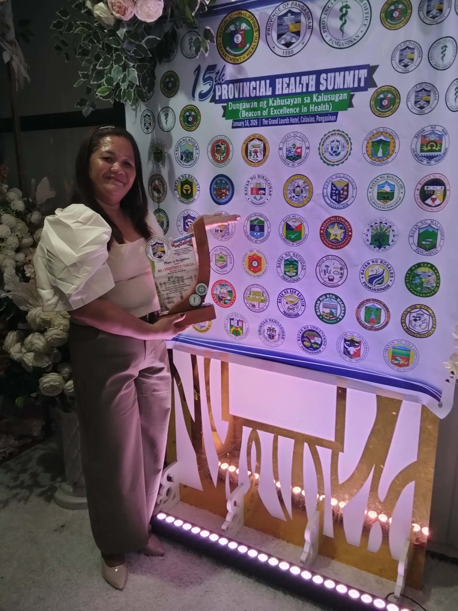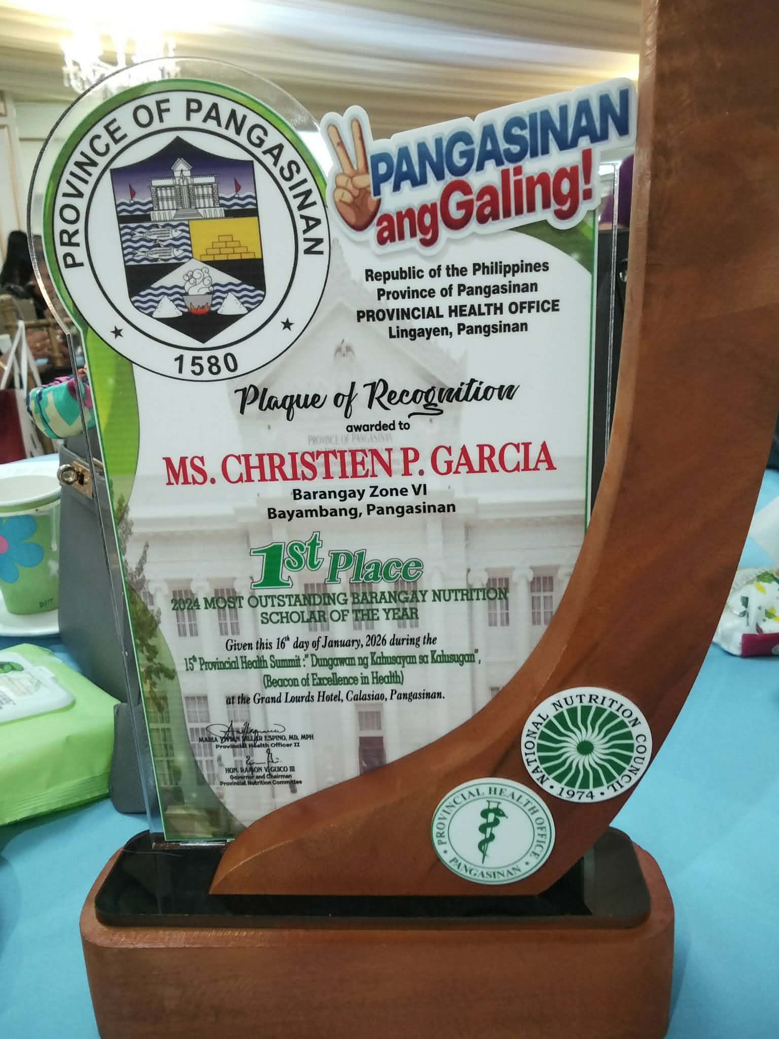 Ang naturang parangal ay pormal na iginawad sa 15th Provincial Health Summit: “Dungawan ng Kahusayan sa Kalusugan (Beacon of Excellence in Health)” na ginanap noong Enero 16, 2026 sa Grand Lourds Hotel, Calasiao. Kinilala ang natatanging kontribusyon ng Ms. Christien P. Garcia, Barangay Nutrition Scholar ng Brgy. Zone VI, Bayambang, na tumanggap ng Plaque of Recognition at Cash Award bilang pagkilala sa kanyang masigasig na paglilingkod sa larangan ng nutrisyon sa komunidad.